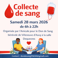 Samedi 28 mars, 06h00 : Collecte de sang Samedi 28 mars 2026 de 6h à 22h, organisée par l'Amicale pour le Don de Sang bénévole de Villeneuve d'Ascq à la salle Dequesnes. Contact : dondusang59650@gmail.com